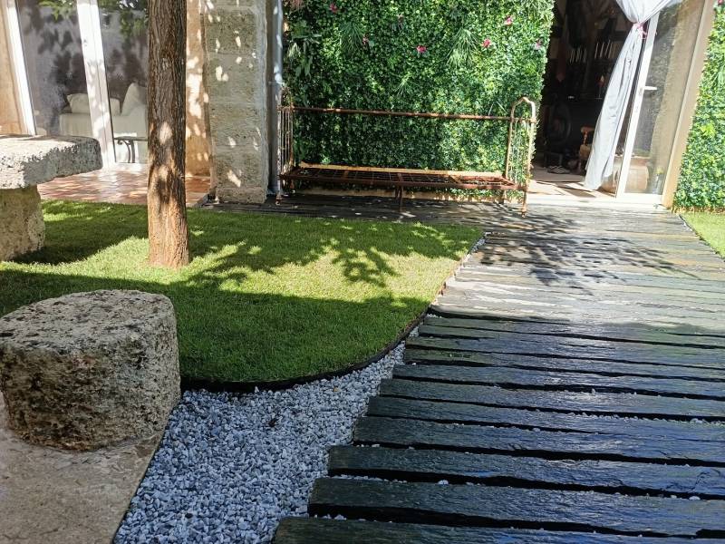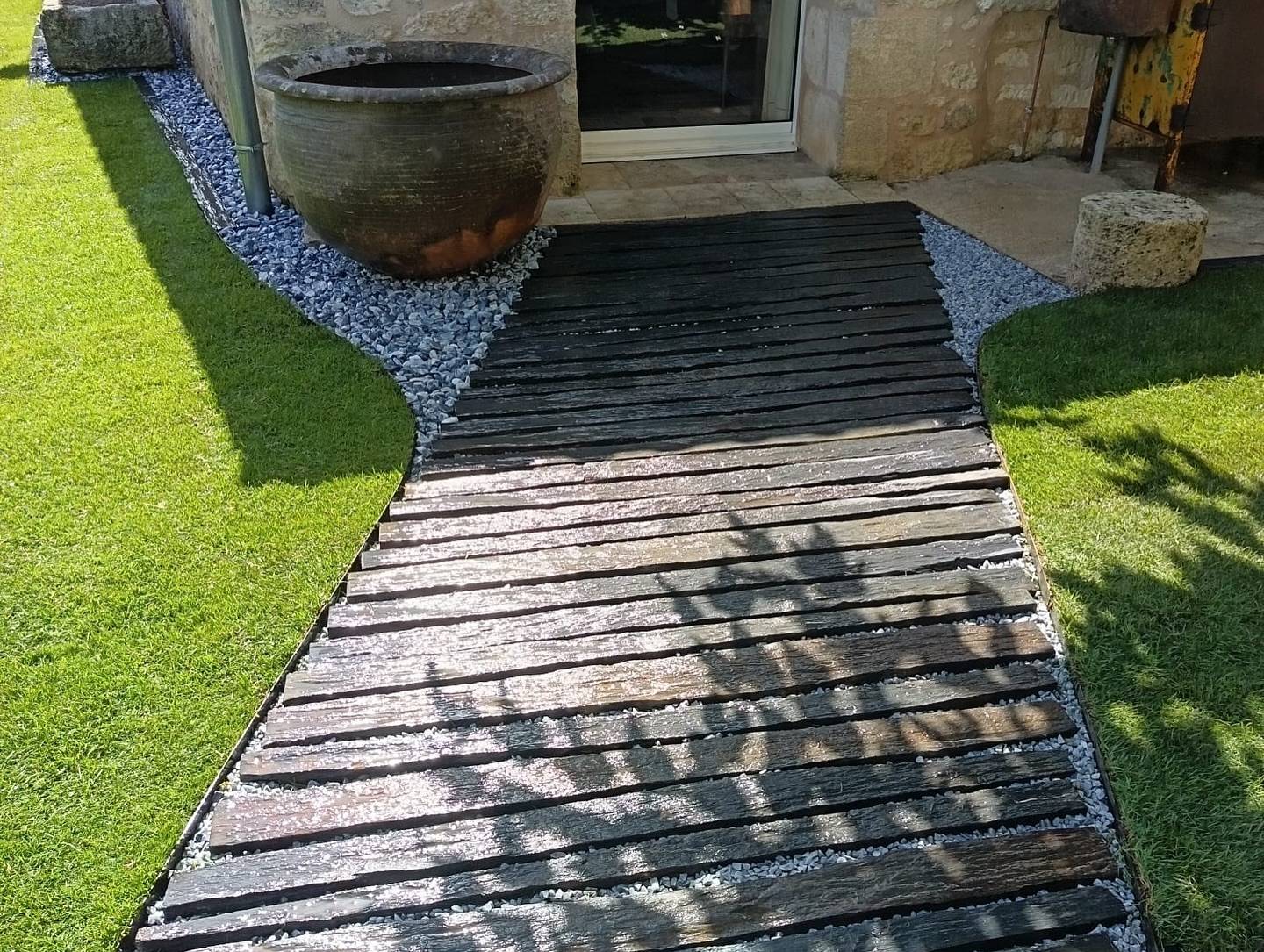 Le projet a débuté par la création d’une allée piétonne avec piquets de schiste de 1m50, permettant de délimiter les espaces tout en apportant une touche naturelle au jardin. Le schiste, matériau résistant, offre un rendu qui met en valeur l’ensemble de l’aménagement.