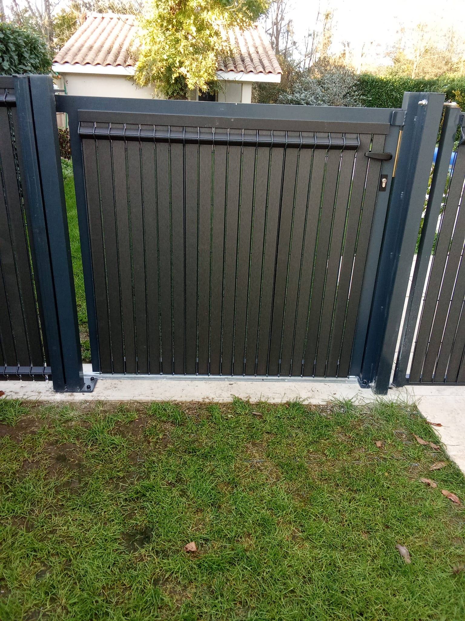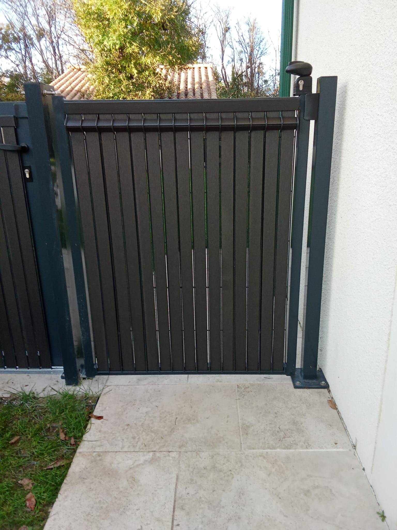 Le portillon installé comprend un cadre avec remplissage en grille, associé à des panneaux occultants permettant de préserver l’intimité tout en conservant une bonne résistance dans le temps. Ce type de configuration offre un excellent compromis entre sécurité, discrétion et esthétisme.